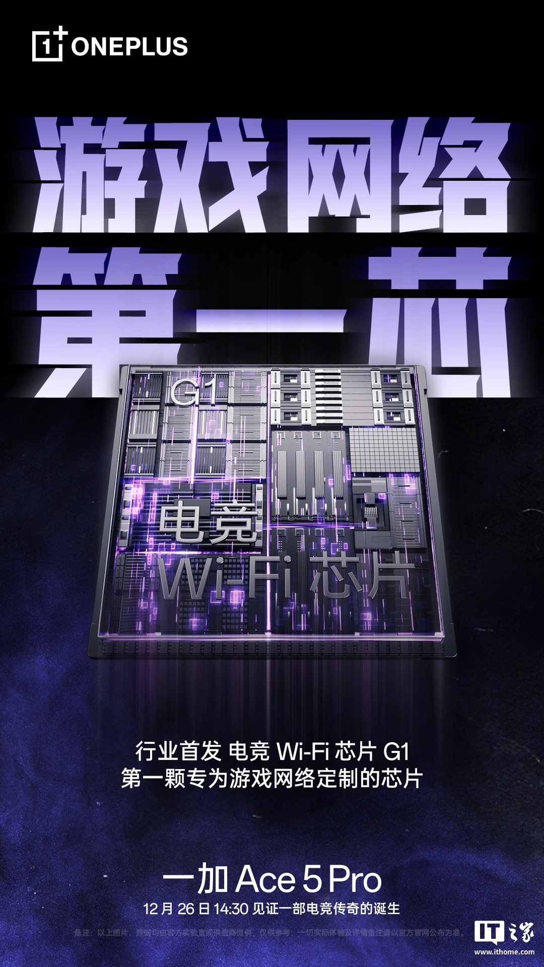 IT之家 12 月 23 日消息,一加 Ace 5 系列手机将于本周(12 月 26 日)发布。一加官方今日宣布,一加 Ace 5 Pro 手机行业首发“电竞 Wi-Fi 芯片 G1”。