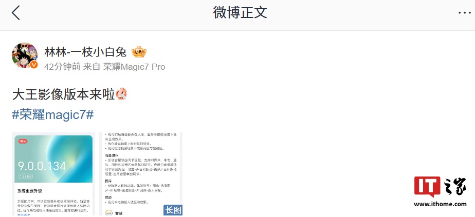 文章来源于互联网:IT之家-大王影像升级:荣耀 Magic7 系列手机获推 MagicOS 9.0.0.134,新增 AI 长焦风景等功能