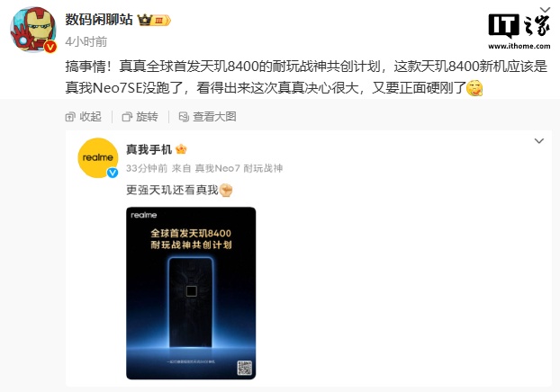 IT之家 12 月 23 日消息,realme 真我今日官宣,全球首发联发科天玑 8400 耐玩战神共创计划。随后,博主 @数码闲聊站 透露:“这款天玑 8400 新机应该是真我 Neo7 SE 没跑了”。