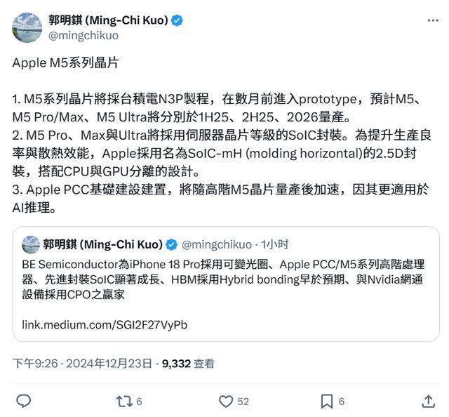 IT之家 12 月 23 日消息,天风国际分析师郭明錤今晚在 X 平台发文披露苹果 M5 系列芯片的部分进展: