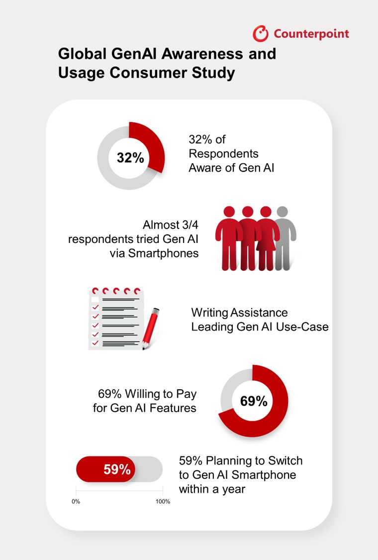 Counterpoint 研究总监 Tarun Pathak 指出,Gen AI 之所以快速普及,是因为它易于访问且功能多样,简化了写作、编辑和研究等日常任务。