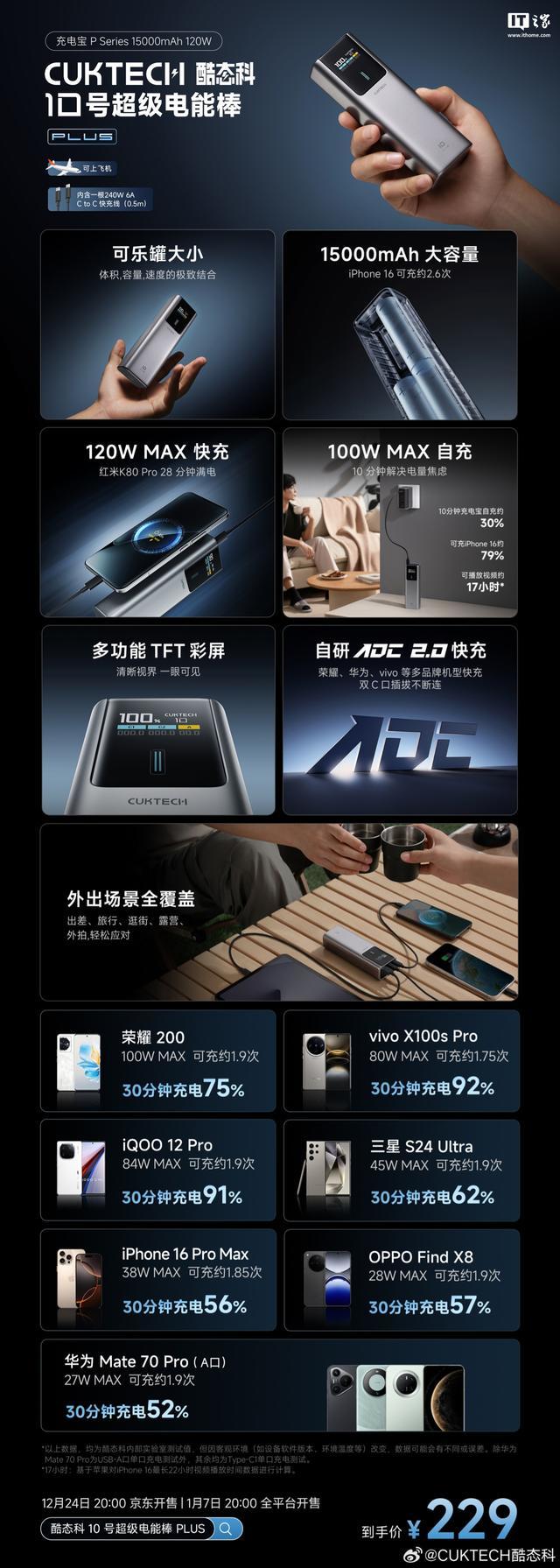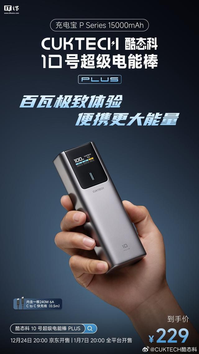 IT之家 12 月 24 日消息,酷态科今日发布了 10 号超级电能棒 Plus 新品,首发价 229 元,今日(12 月 24 日)20:00 京东开售。