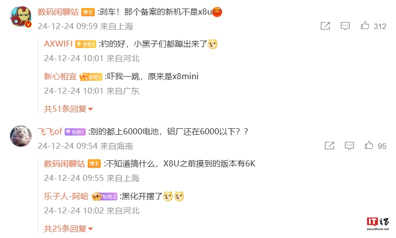 该名博主在评论区中补充称“那个备案的新机不是 X8U”(预计指 OPPO Find X8 Ultra 手机)。另外,针对网友询问的 OPPO 新机电池容量问题,博主回复“不知道搞什么,X8U 之前摸到的版本有 6K”。