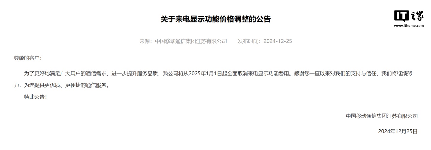 IT之家 12 月 25 日消息,中国移动通信集团江苏有限公司今日发布关于来电显示功能价格调整的公告,从 2025 年 1 月 1 日起全面取消来电显示功能费用。