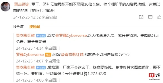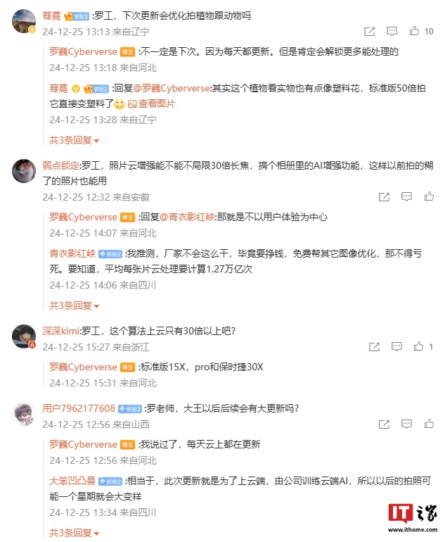 另外,罗巍还在评论区中回复了部分网友的留言:针对下次更新是否会优化拍植物跟动物,他称“不一定是下次。因为每天都更新。但是肯定会解锁更多能处理的”;针对不会免费帮其它图像优化的问题,他回复“那就是不以用户体验为中心”;针对算法上云是否只有 30 倍以上,他表示“标准版 15X,Pro 和保时捷 30X”。