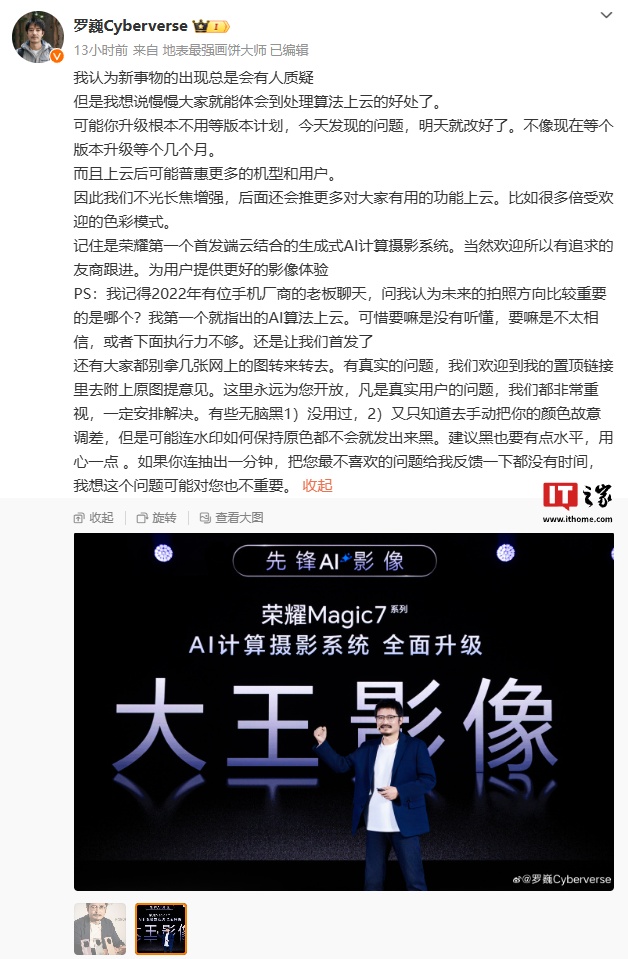 文章来源于互联网:IT之家-荣耀首席影像工程师罗巍:处理算法上云后可能不用等版本更新,今天发现的问题明天就改好