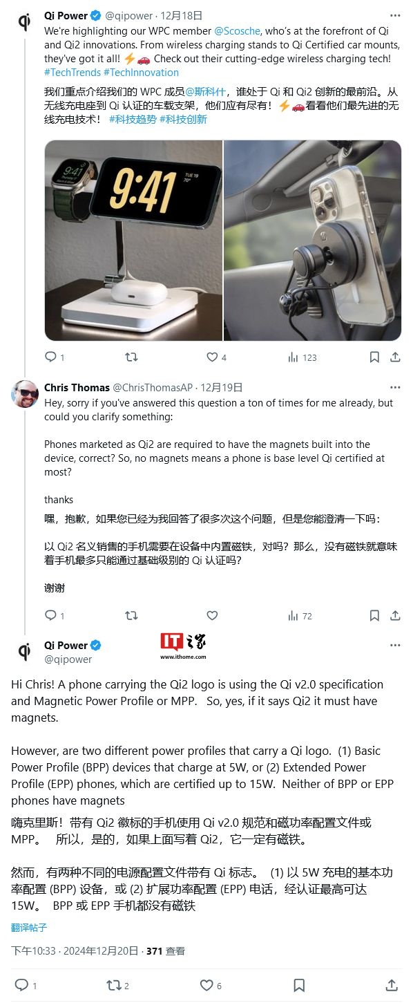 无线充电联盟(WPC)于 12 月 20 日在 X 平台发布推文,确认所有带有 Qi2 标志的设备都支持磁力配置文件(MPP),该配置文件源自苹果 MagSafe 标准,可实现磁吸对齐无线充电。IT之家附上截图如下:
