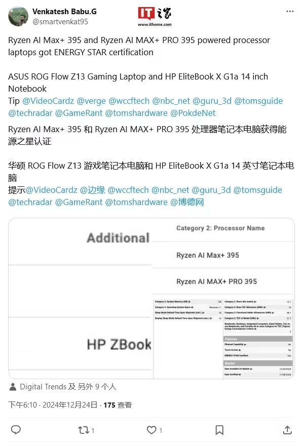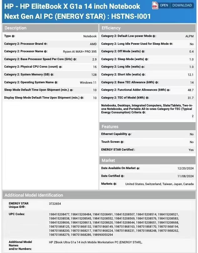 IT之家 12 月 26 日消息,科技媒体 videocardz 昨日(12 月 25 日)发布博文,报道称惠普新款 ZBook Ultra G1a(EliteBook X G1a)工作站笔记本已通过 Energy Star 认证,显示搭载 AMD 锐龙 AI MAX+ PRO 395 APU。