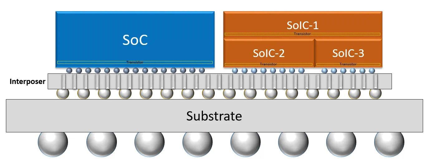 你可以想象成叠叠乐,借助SoIC封装,现在厂商可以在垂直尺度上将多个同质和异质的小芯片/裸片整合在同一设计中,这样就可以使芯片在更小的区域面积下添加更多功能,而且多层堆叠的理念,也让SoIC在同样的工艺条件下可以具备更多的晶体管层,集成密度更高。