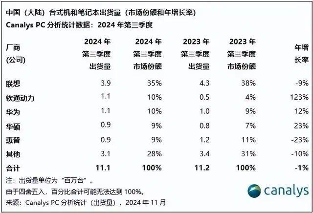 根据知名数据调研公司Canalys出炉的2024年第三季度中国市场PC市场报告,在刚刚过去的第三季度,国内PC市场整体出货量达到1110万台,同比下滑1%,联想出货量为390万台,市场份额高达38%,华为则以9%的市场份额排在第三位。