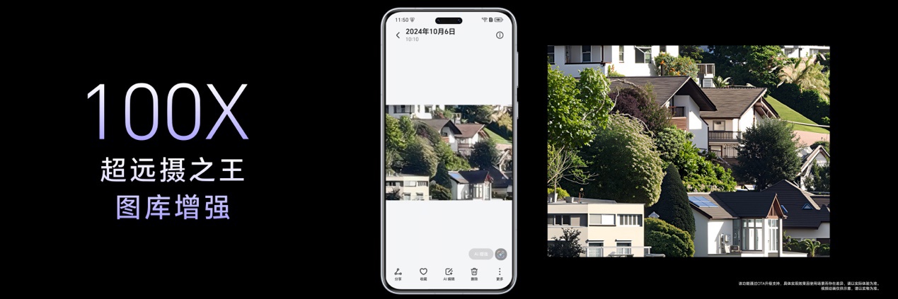 在此基础上,荣耀大王影像升级还带来全新 AI 超级长焦功能,优化了 30x-100x 超长望远焦段的拍照清晰度。整个拍照过程会基于部署在云端的 124 亿参数大模型,通过训练 AI 学习建筑、自然风光、植物等场景类别的主体拍摄物理特征,让镜头及传感器采集的光学信息进行归纳总结。