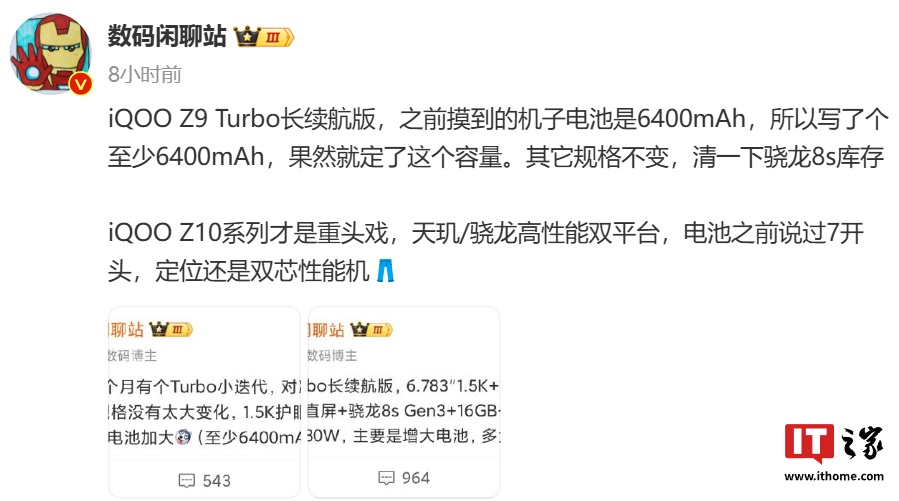 IT之家 12 月 26 日消息,iQOO Z9 Turbo 长续航版手机将于明年 1 月发布,该机将搭载高通骁龙 8s Gen3 处理器、内置 6400mAh 超薄蓝海电池。