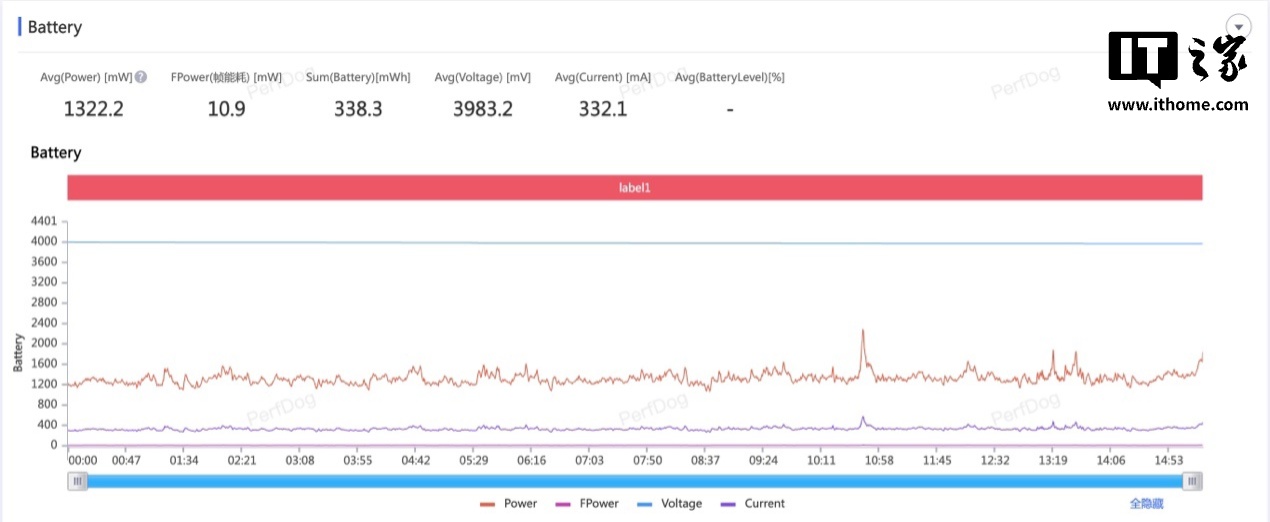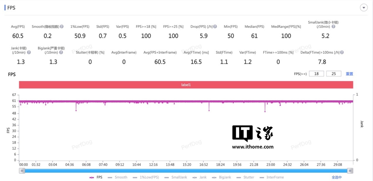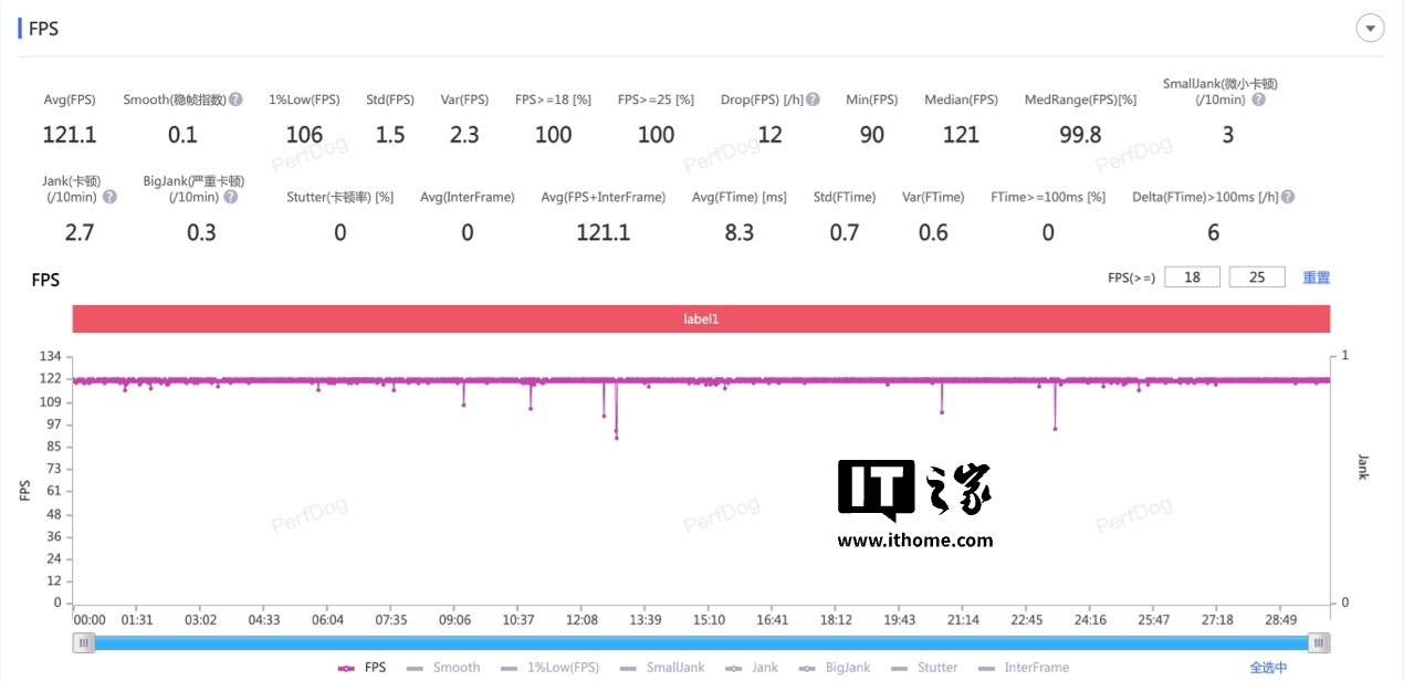 实际性能表现我们直接通过游戏实测来了解一下。先看看负载不高的《王者荣耀》。在 30 分钟 120 帧 + 极致画质下,连续排位比赛 30 分钟,2 局对战的帧数表现都很稳,帧率曲线平直,平均功耗都在 120 帧。