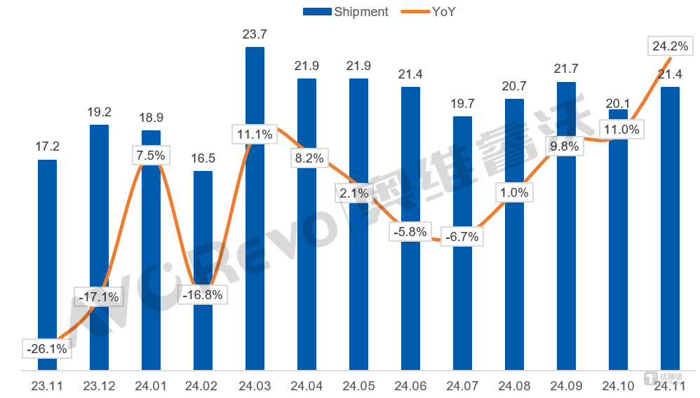 根据GfK中怡康零售监测,2024年9月,彩电一/二级能效等级产品的零售额份额占比创新高,线上零售额份额达24.1%,较去年同期增加10.4个百分点,线下零售额份额达48.3%,较去年同期增加23个百分点。洛图科技的数据也显示,今年第四季度,中国电视市场的品牌整机出货量预计将达到1120万台,同比增长4.1%。