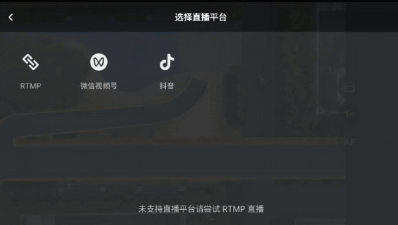 起飞后,在飞行界面点击右上角[…」-「图传」-「选择直播平台」-「抖音」,即可使用抖音直播功能。