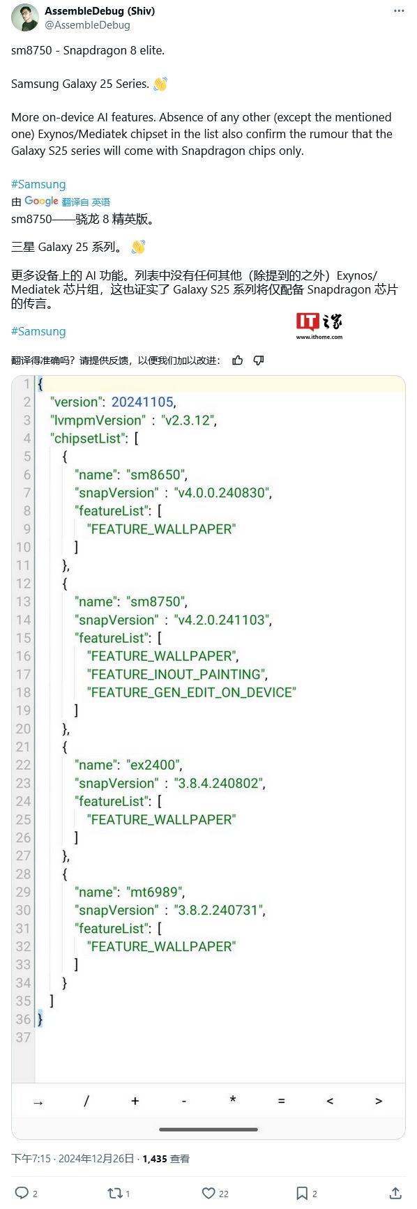 IT之家 12 月 27 日消息,消息源 AssembleDebug 昨日(12 月 26 日)在 X 平台发布推文,挖掘代码发现三星 Galaxy S25 系列将通过高通骁龙 8 至尊版芯片,减少对云服务的依赖,可以借助端侧 AI 模型,编辑和生成照片。