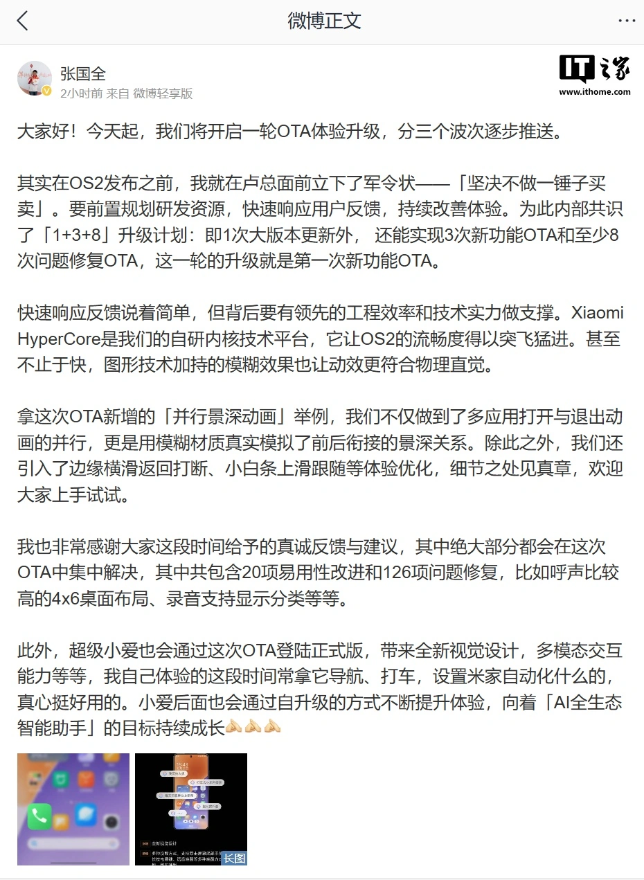 对此,小米手机系统软件部总监张国全发文称,今天起将开启一轮 OTA 体验升级,分三个波次逐步推送。