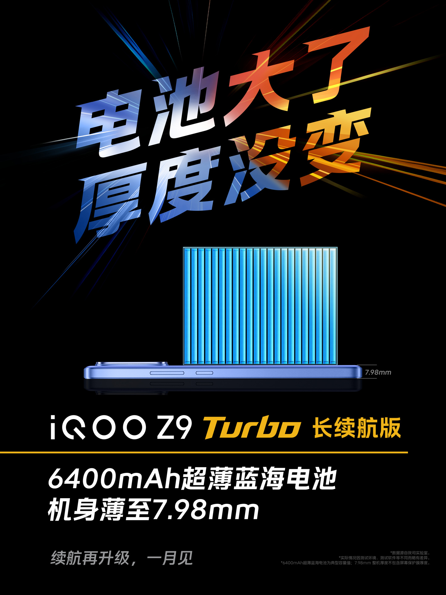 IT之家 12 月 27 日消息,iQOO Z9 Turbo 长续航版手机将于明年 1 月发布,新机确认将内置 6400mAh 超薄蓝海电池,厚度约 7.98mm、重约 196g。