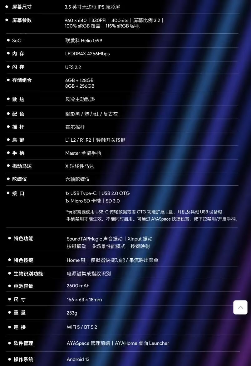 AYANEO Pocket MICRO 采用 CNC 铝合金中框工艺,配备 3.5 英寸 IPS 原彩屏,屏幕分辨率 960×640,可以实现 4 倍整数倍缩放;掌机内置 2600mAh 电池,复古游戏下续航超 6 小时,整机尺寸为 156×63×18mm,重量约 233g。