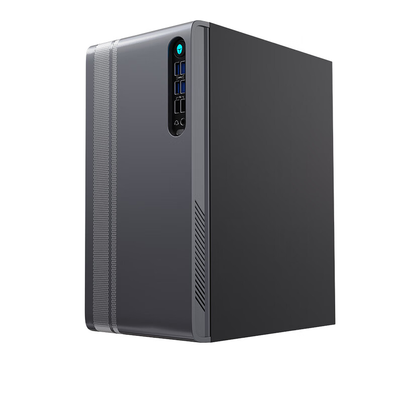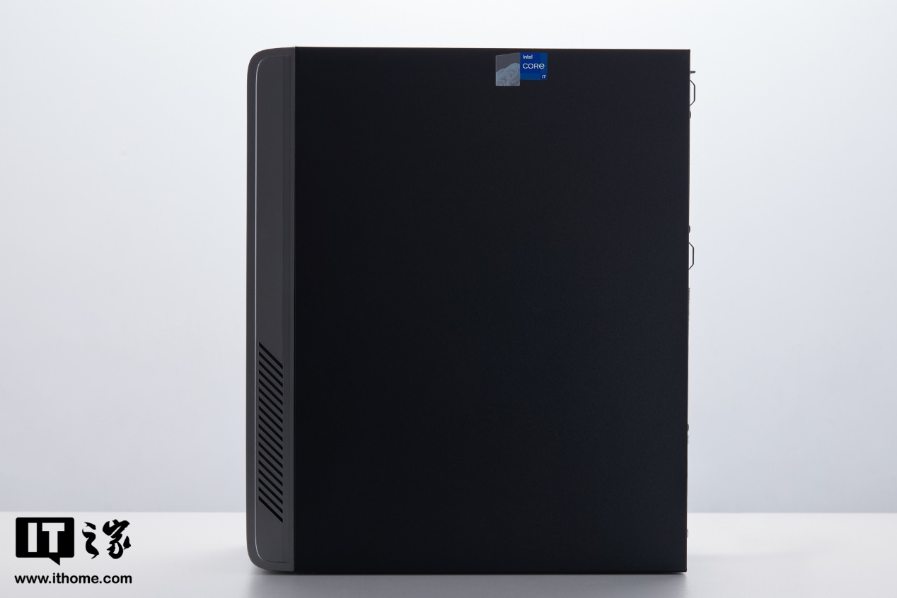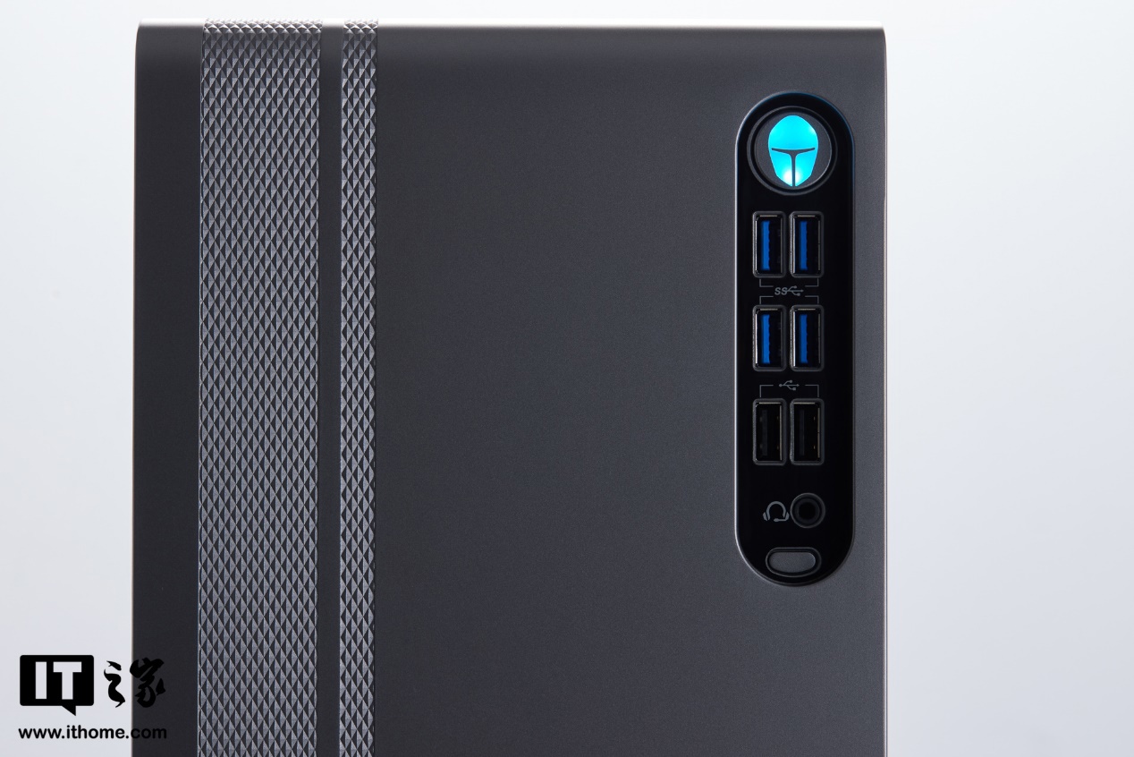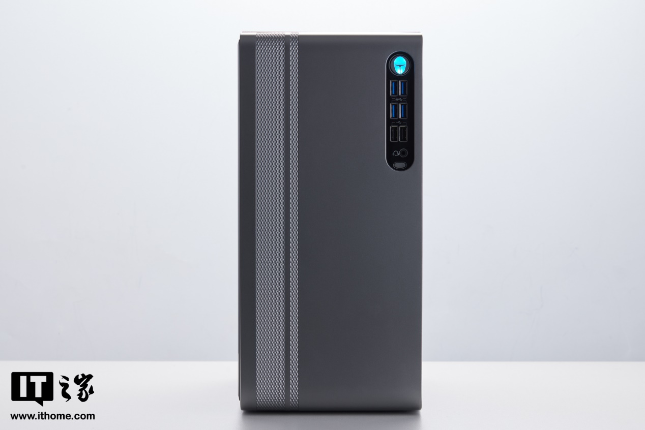 机箱前面板左侧是两条竖向排列的三角格纹装饰,右上角做了 1 个竖向椭圆形嵌入式前置 I/O 接口组。