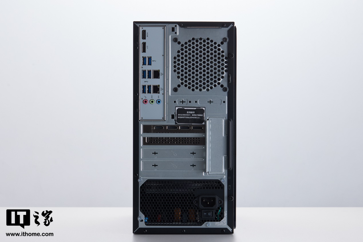 机箱背部类似于常规的台式办公机箱设计,I/O 接口组部分提供了 6 个 USB A 接口,1 个 HDMI1.4+DP1.2 视频接口组,2 个 RJ45 网口规格分别为 RTL8111M 的 1G 网络接口和 RTL8125 的 2.5G 网络接口。官方表示,双网口可同时连接内部局域网和外部互联网,还可以实现网络隔离,网口备份以及软路由等功能。