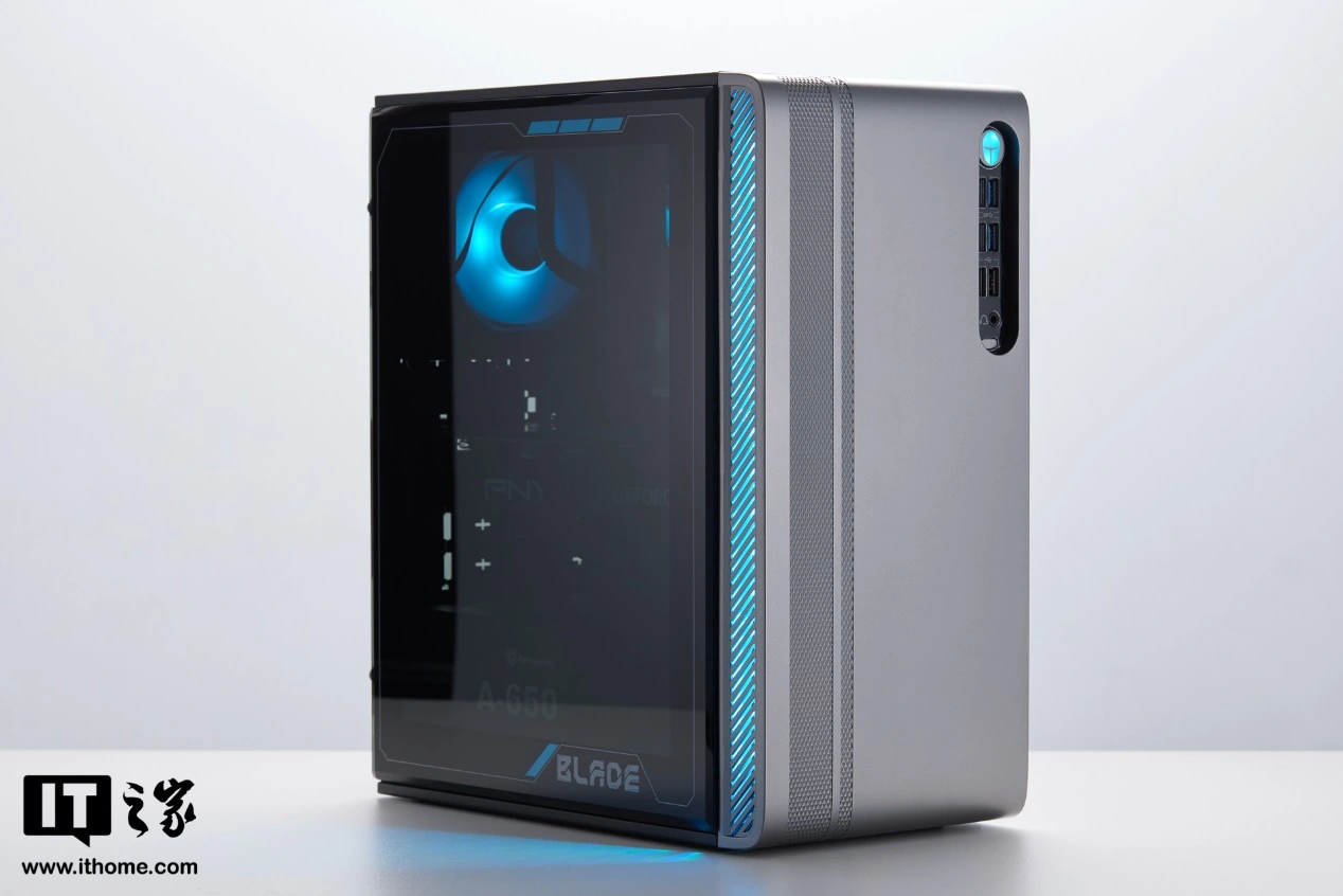 文章来源于互联网:IT之家-【IT之家图赏】雷神黑武士猎刃游戏主机图赏:17L 小机箱,冰蓝灯光 + 电竞风设计