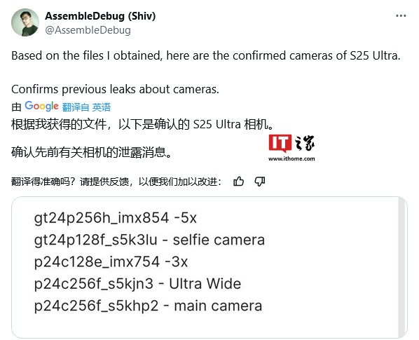 IT之家 12 月 28 日消息,@AssembleDebug 今天(12 月 28 日)在 X 平台发布推文,基于泄露的文件,曝料三星 Galaxy S25 Ultra 手机的相机规格。