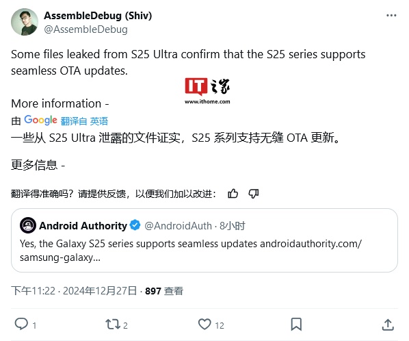 IT之家 12 月 28 日消息,消息源 AssembleDebug 通过挖掘代码,发现新的证据表明三星 Galaxy S25 系列手机将突破性支持 A / B 无缝更新。
