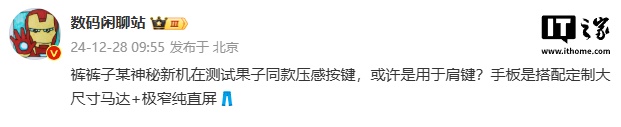IT之家 12 月 28 日消息,博主 @数码闲聊站 今日爆料称,iQOO 神秘新机测试苹果同款压感按键,或许是用于肩键(存疑),手板是搭配定制大尺寸马达 + 极窄纯直屏。