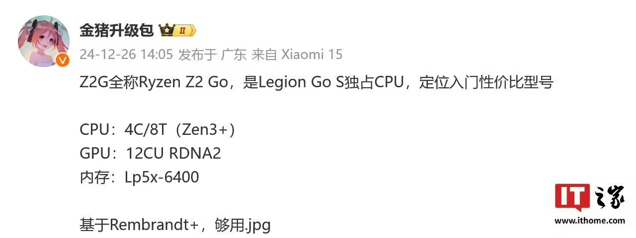 IT之家 12 月 30 日消息,消息人士 @金猪升级包 本月 26 日在微博表示,联想 Legion Go S 低阶游戏掌机将独占 AMD 即将于 CES 2025 发布的入门性价比级掌上 PC 游戏机处理器锐龙 Z2 Go(Z2G)。