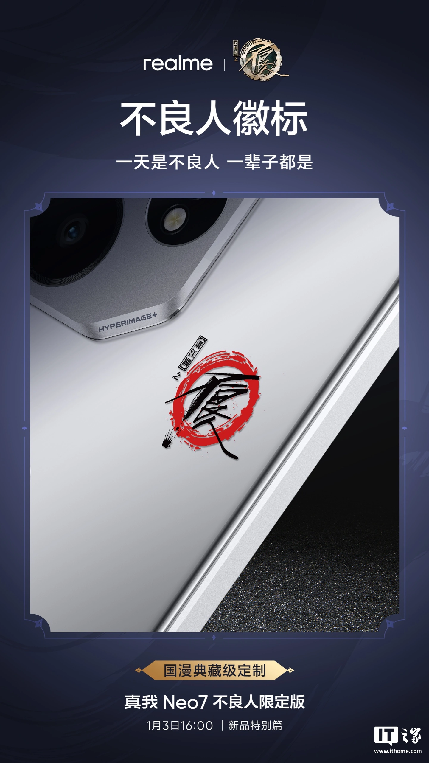 IT之家 12 月 30 日消息,realme 真我 Neo7 手机“不良人限定版”将于 2025 年 1 月 3 日 16:00 发布,新机“剑魂银”配色外观已于今日公布。
