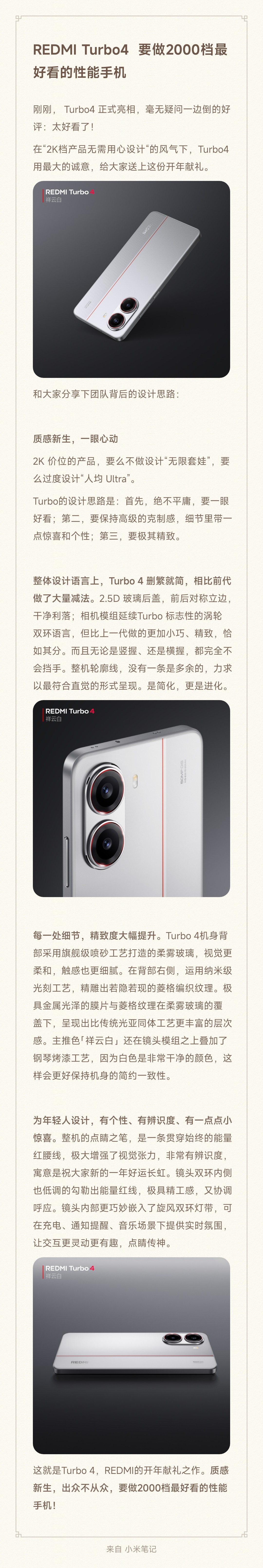 文章来源于互联网:IT之家-小米 REDMI Turbo 4 手机采用 2.5D 玻璃后盖,主推色“祥云白”镜头模组叠加钢琴烤漆工艺