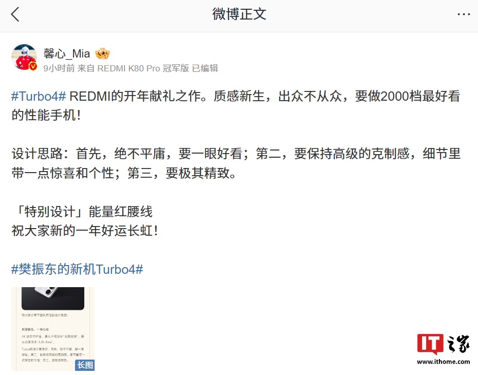 IT之家注意到,REDMI 产品经理胡馨心今日发文公布了新机设计细节:REDMI Turbo 4 手机将采用 2.5D 玻璃后盖,主推色“祥云白”在镜头模组上叠加钢琴烤漆工艺,「特别设计」能量红腰线。