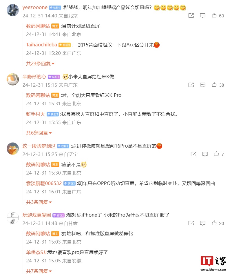 博主在评论区中回复了部分网友问题:针对明年一加是否会改为直屏设计,博主称“目前计划是切直屏”;针对 REDMI 品牌新机定位,博主回复“对,全能大直屏看红米 K Pro”;针对小米 Pro 机型不改为直屏的原因,博主表示“要堆料吧,和标准版直屏做差异化”。