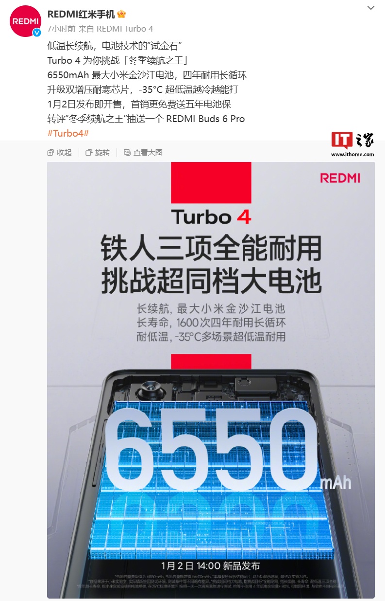 据IT之家今日早些时候报道,REDMI Turbo 4 手机搭载 6550mAh 最大小米金沙江电池,支持 1600 次四年耐用长循环。该机还配备双增压耐寒芯片,号称 -35°C 超低温也能使用。