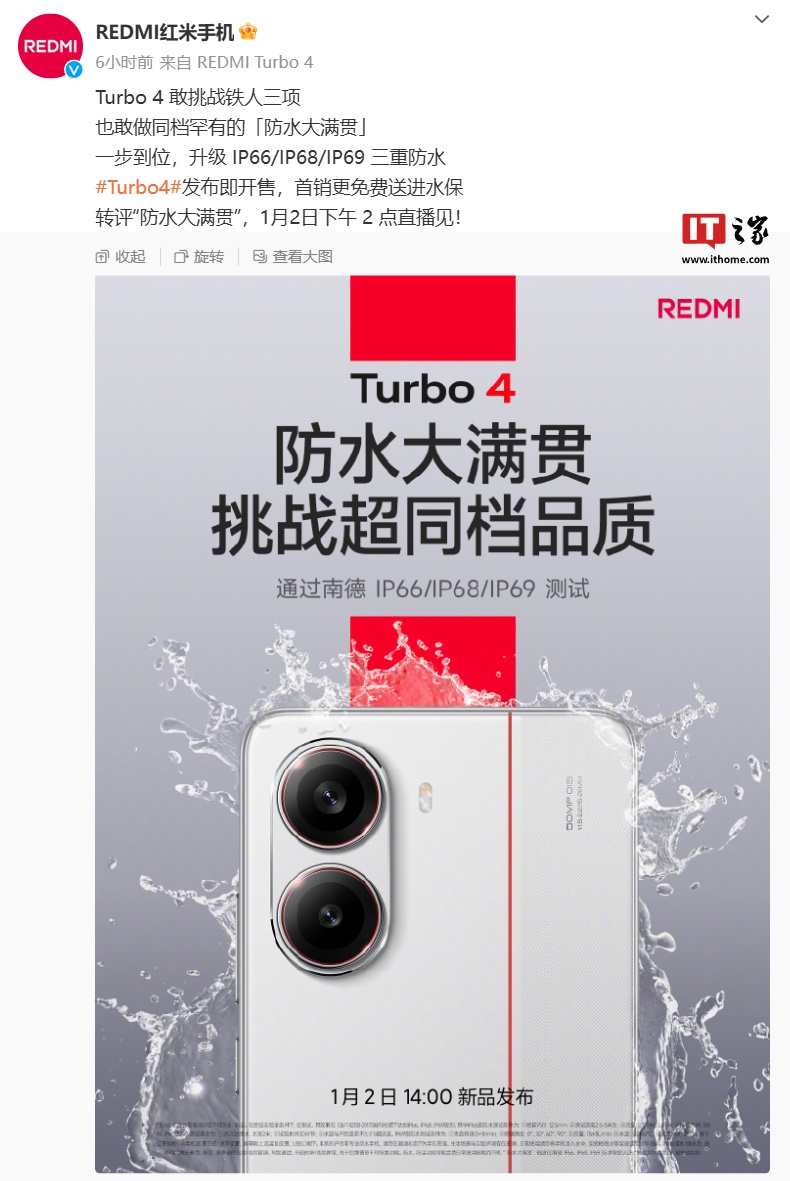 根据官方最新预热,小米 REDMI Turbo 4 手机升级 IP66 / IP68 / IP69 三重防水,并通过了南德 IP66 / IP68 / IP69 测试,官方宣称「防水大满贯」。