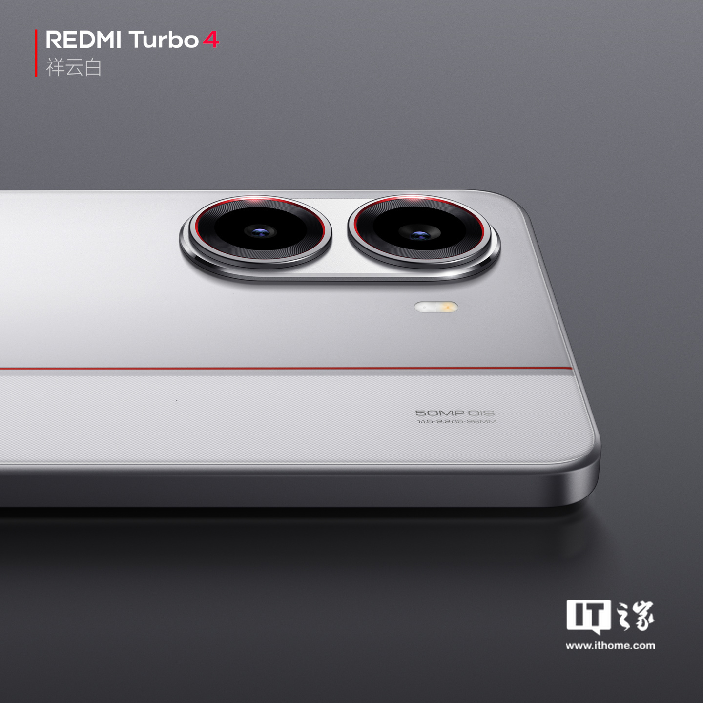 IT之家 12 月 31 日消息,小米 REDMI Turbo 4 手机已于昨日正式亮相,定档 2025 年 1 月 2 日 14:00 发布。新机后置全金属相机 Deco、并配备“全新旋风双环灯带”,将提供至少三种配色(黑 / 青 / 祥云白)。