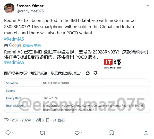 IT之家 12 月 31 日消息,消息源 @erenylmaz075 今天(12 月 31 日)在 X 平台发布推文,在挖掘 GSMA IMEI 数据库后,发现了 REDMI A5 手机的踪迹,从型号判断可能会在 2025 年 2~3 月之间发布。
