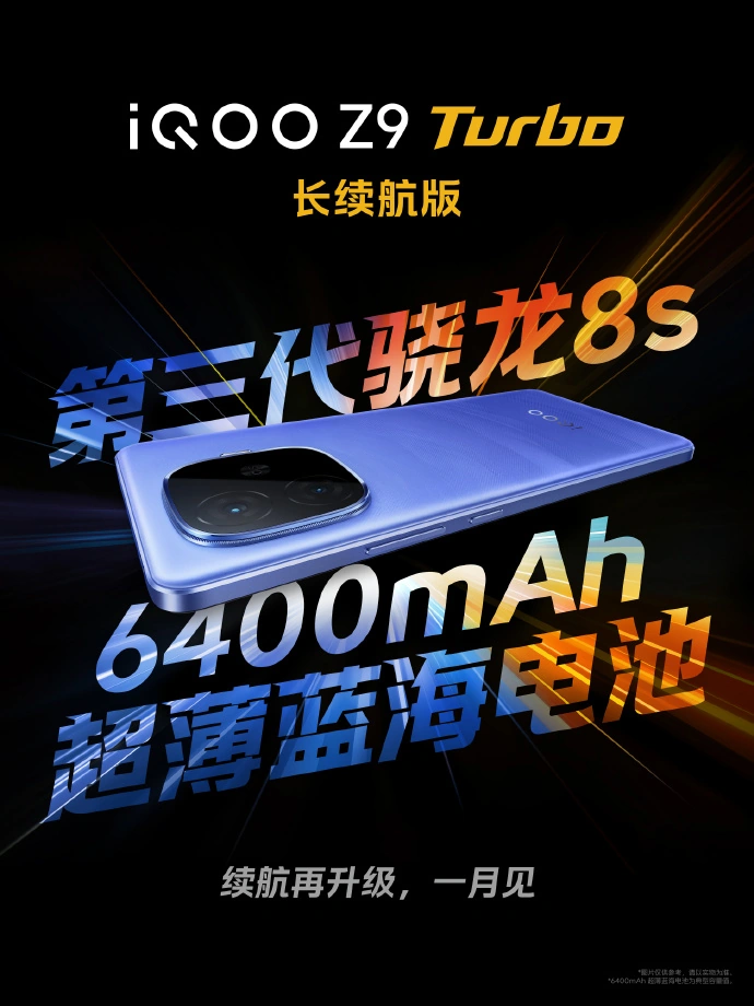 IT之家 12 月 31 日消息,iQOO Z9 Turbo 长续航版手机将于 2025 年 1 月 3 日 10:00 开售,新机将搭载骁龙 8s Gen3 处理器 + 独显芯片 Turbo、内置 6400mAh 电池。