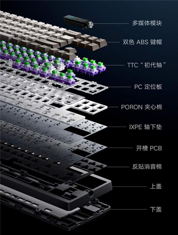 这是小米自家第一款Gasket结构键盘,填充有PORON夹心棉、IXPE轴下垫、消音棉等,消除大部分空腔音,避免硬性碰撞产生的杂音,敲击手感柔弹舒适。