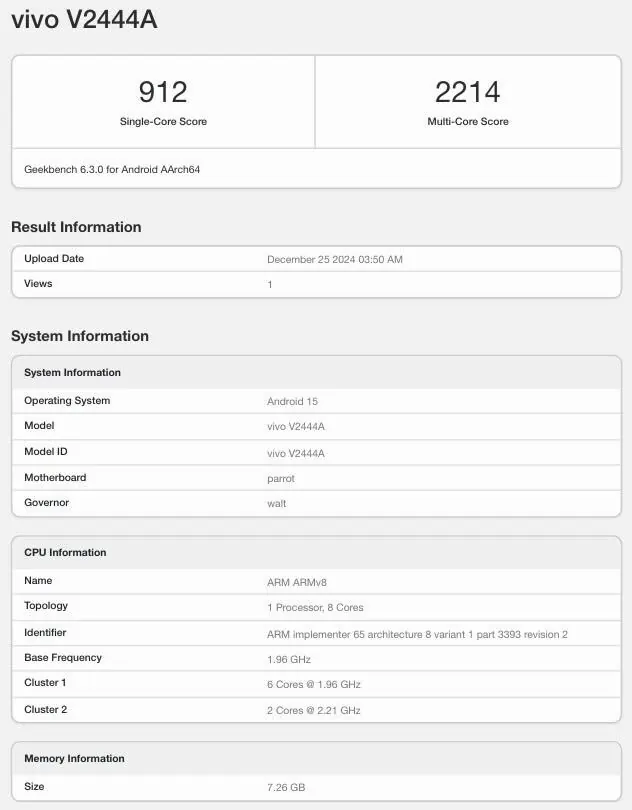 IT之家 1 月 2 日消息,此前有消息称 Vivo 正在筹备全新子品牌“Jovi”,瞄准入门级和经济型智能手机市场。MySmartPrice 在 Geekbench 跑分平台上发现了一款疑似 Jovi 品牌的新机,型号为 V2444A,或将命名为 Jovi Y39 5G。