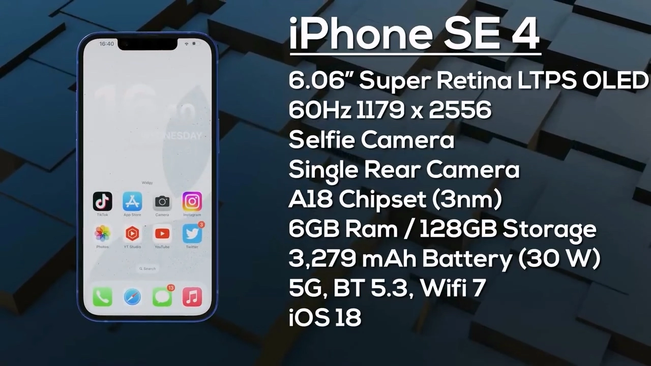该机可能会采用 6.06 英寸 60Hz OLED 屏幕。该机的相机配置与 iPhone 16 的主摄像头和前置摄像头相同,均为 4800 万像素后置“Fusion”镜头(可拍摄标准照片和 2 倍变焦照片)和 1200 万像素 TrueDepth 前置摄像头,但 SE 4 缺少超广角镜头。