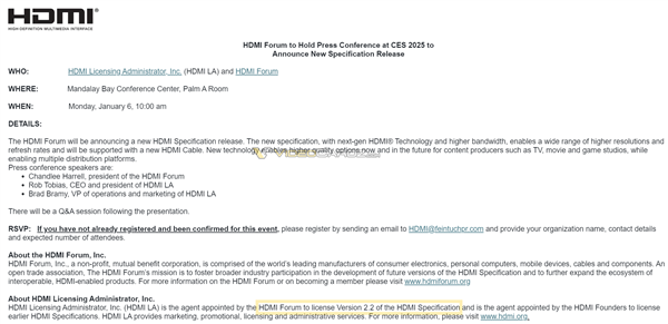 HDMI许可管理公司发给媒体的一封邮件中确认,HDMI论坛将会在当地时间1月6日10点(北京时间7日2点),正式发布新版HDMI 2.2。