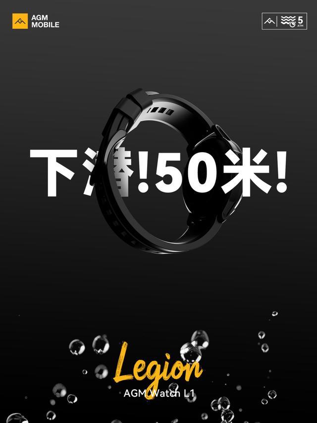 据介绍,AGM 首款智能手表 Watch L1 拥有 5ATM(相当于 5 个大气压)级别防水性能,理论上支持 50 米水深防水,官方提供一年期进水保修服务。