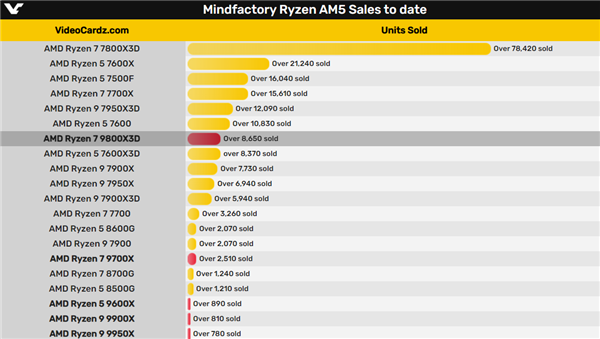 相比之下,锐龙9000系列首批四款标准型号早上市2个多月,MindFactory的总销量合计才4190颗,还不到锐龙7 9800X3D的一半。