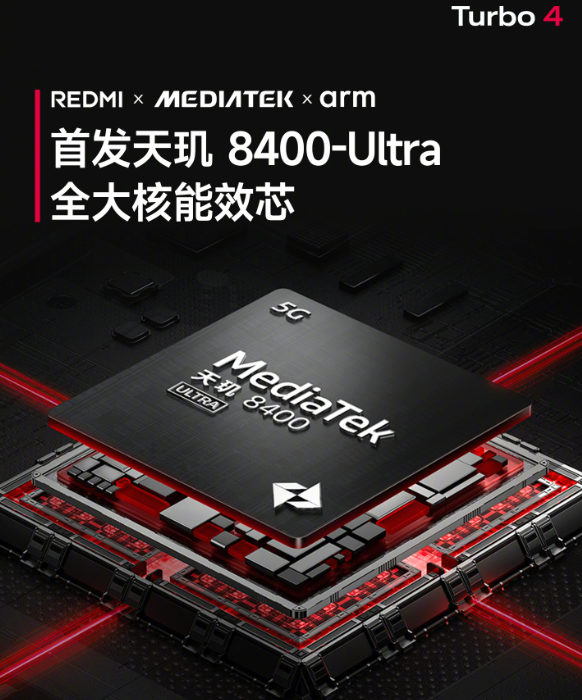 1 月 2 日下午,REDMI 举行了新品发布会,正式推出了全新 REDMI Turbo 4 手机。这款手机最大的看点,莫过于首发联发科全新的天玑 8400-Ultra 平台。在不久前的联发科天玑 8400 芯片发布会上,REDMI 官方也提前做了预告。