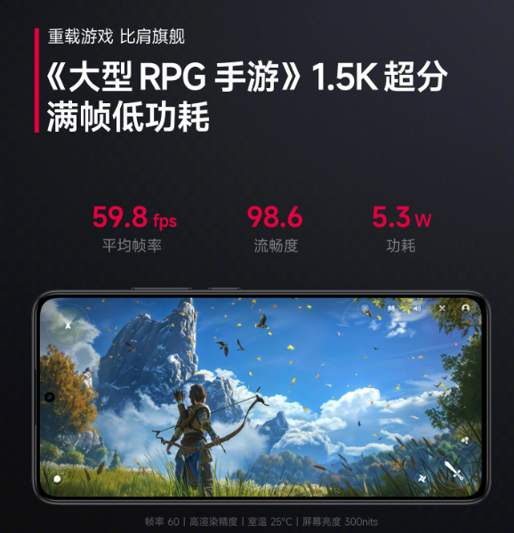 而在高渲染精度、室温 25℃、屏幕亮度 300nits 的环境下进行 30 分钟《原神》手游 1.5K 超分测试,REDMI Turbo 4 也能跑到 59.8fps 的帧率,流畅度 98.6,平均功耗为 5.3W。