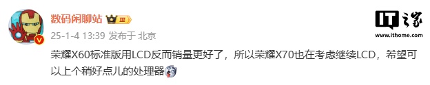 IT之家 1 月 4 日消息,博主 @数码闲聊站 今日爆料称,荣耀 X60 标准版用 LCD 反而销量更好了,所以荣耀 X70 也在考虑继续 LCD。