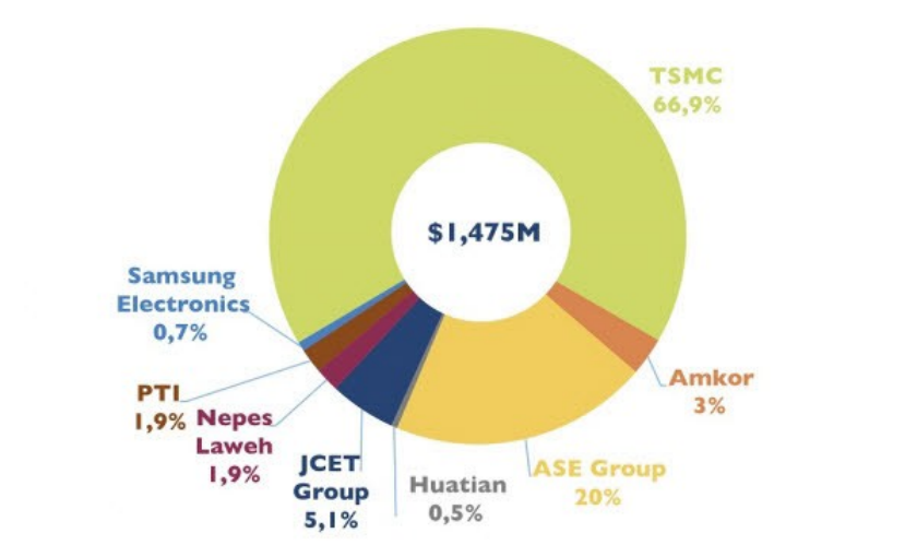根据台积电的财报,其在2023年的先进封装总营收超过60亿美元,在全球外包封装市场中位居第二,倘若只看先进封装,台积电早已是毋庸置疑的No.1。
