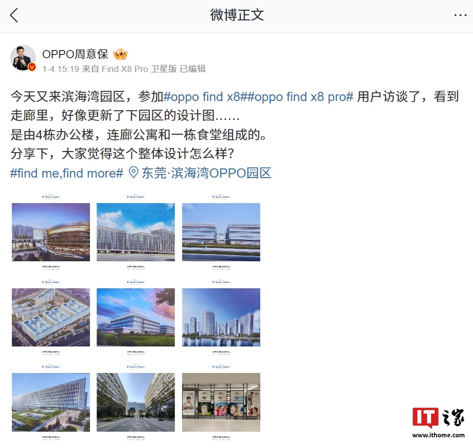 IT之家 1 月 6 日消息,OPPO Find 系列产品负责人周意保本月(1 月 4 日)发文透露去滨海湾园区参加了 OPPO Find X8 系列手机用户访谈,并分享了园区照片。他还在评论区中表示“研发已经入驻了,我今年下半年会搬过来办公”。